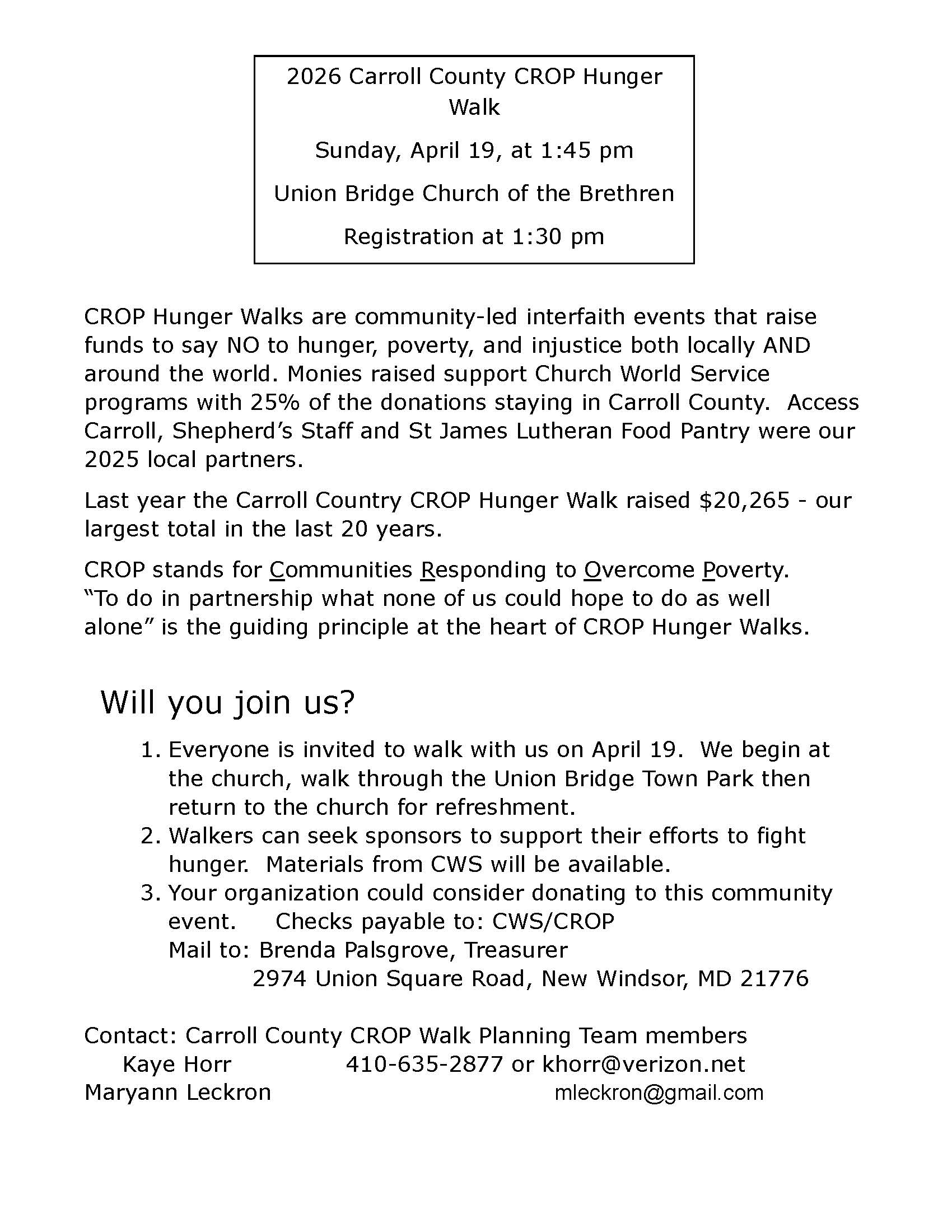 Carroll County Agricultural Center 706 Agricultural Center Dr, Westminster, MD, United StatesSaturday, May 2, 2026 Carroll County Agricultural Center, Westminster, MD Disaster Response Auction Letter to Churches